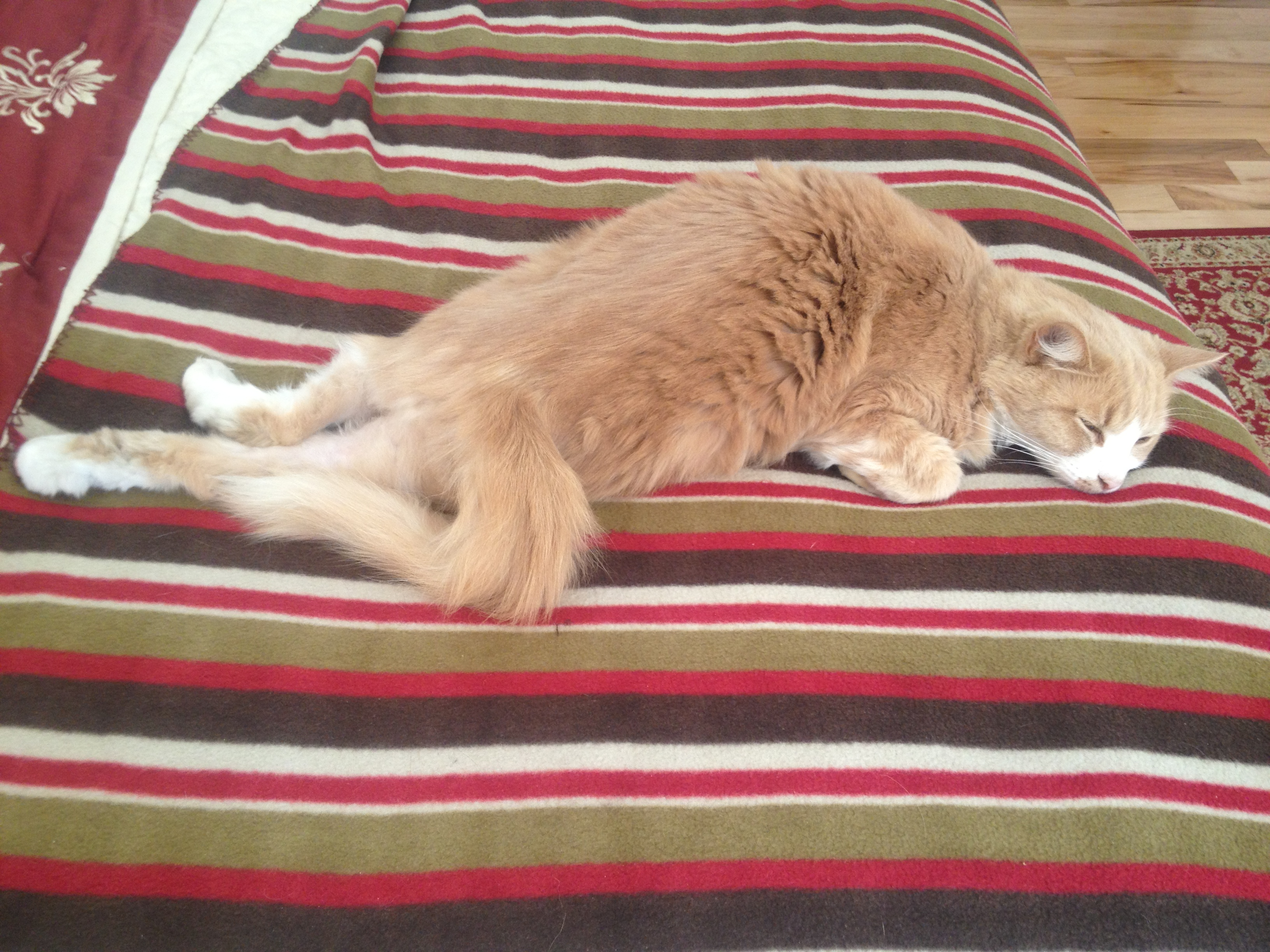 Butters – 12 years old. Male. Long Hair. Very very loving and extremely patient cat. Not a brave one though runs into the house if another cat follows it. 🙂